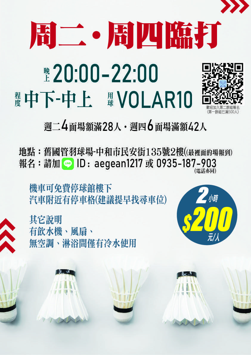 點選下方「確認報名」按鍵後,即代表您將前往:新北市中和區民安街舊國管羽球場(中和區公所羽球館),2025-12-09 星期二 20:00 ~ 22:00的場地。