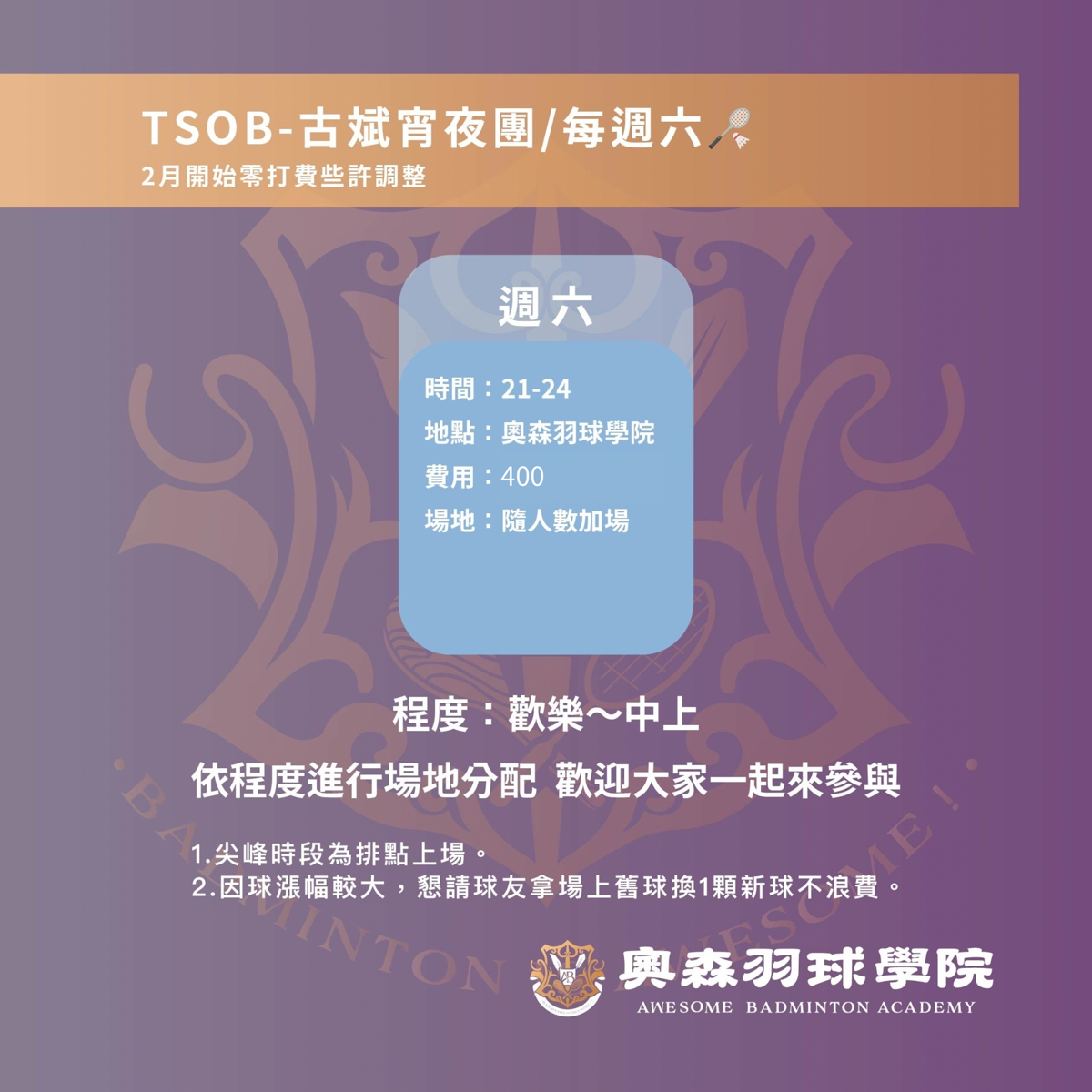 點選下方「確認報名」按鍵後,即代表您將前往:奧森羽球學院,2026-03-21 星期六 21:00 ~ 00:00的場地。
