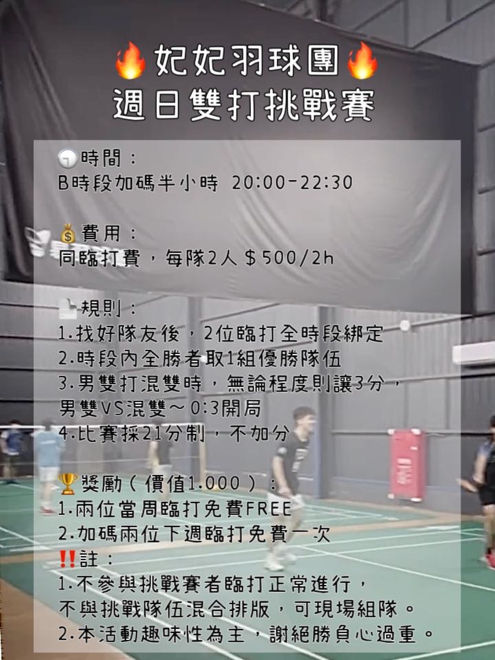 點選下方「確認報名」按鍵後,即代表您將前往:易羽球館,2025-12-07 星期日 18:00 ~ 22:00的場地。