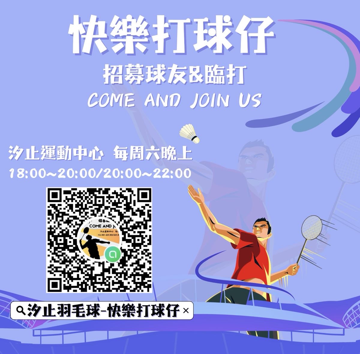 點選下方「確認報名」按鍵後,即代表您將前往:汐止運動中心,2026-01-31 星期六 18:00 ~ 20:00的場地。
