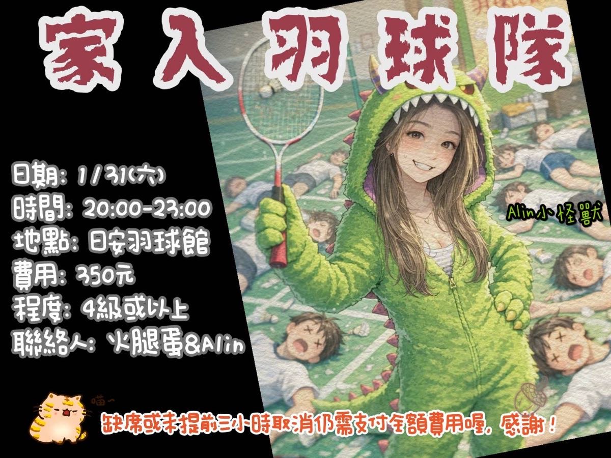點選下方「確認報名」按鍵後,即代表您將前往:日安羽球館(家入羽球隊),2026-03-21 星期六 20:00 ~ 23:00的場地。